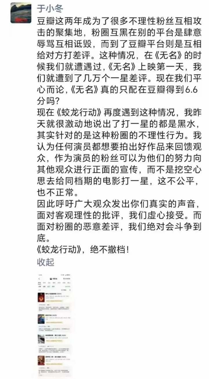 当时的博纳老板于冬还信誓旦旦地说,给他们打一星的都是黑水军,并且说“《蛟龙行动》绝对不撤档”。
