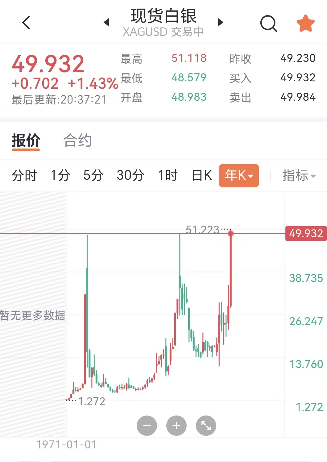 北京时间10月9日,伦敦现货白银突破50美元/盎司大关,一度站上51美元高位,创历史新高,但随后有所回调。