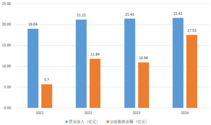 但高毛利的光鲜背后,是现金流的持续失血,2021年至2024年,公司营收从19.04亿增长至21.61亿,增长幅度平缓,但应收账款余额却从5.70亿飙升至17.53亿,三年时间增长超3倍。